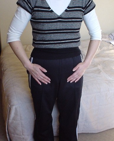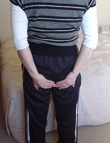 両手の端を腰骨のふちに当てて足に向かって「V」字を作る