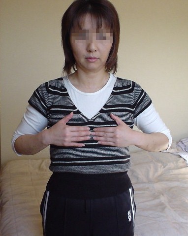 始めに片方の指先を胸腺に当て、もう片方をその指先に触れるようにします |