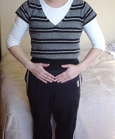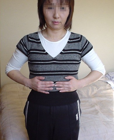 胃の上に手をもっていくとき、あらかじめ山形を作っておき、体に手を当てるときは胃の真上の部分は体に触らないようにする |